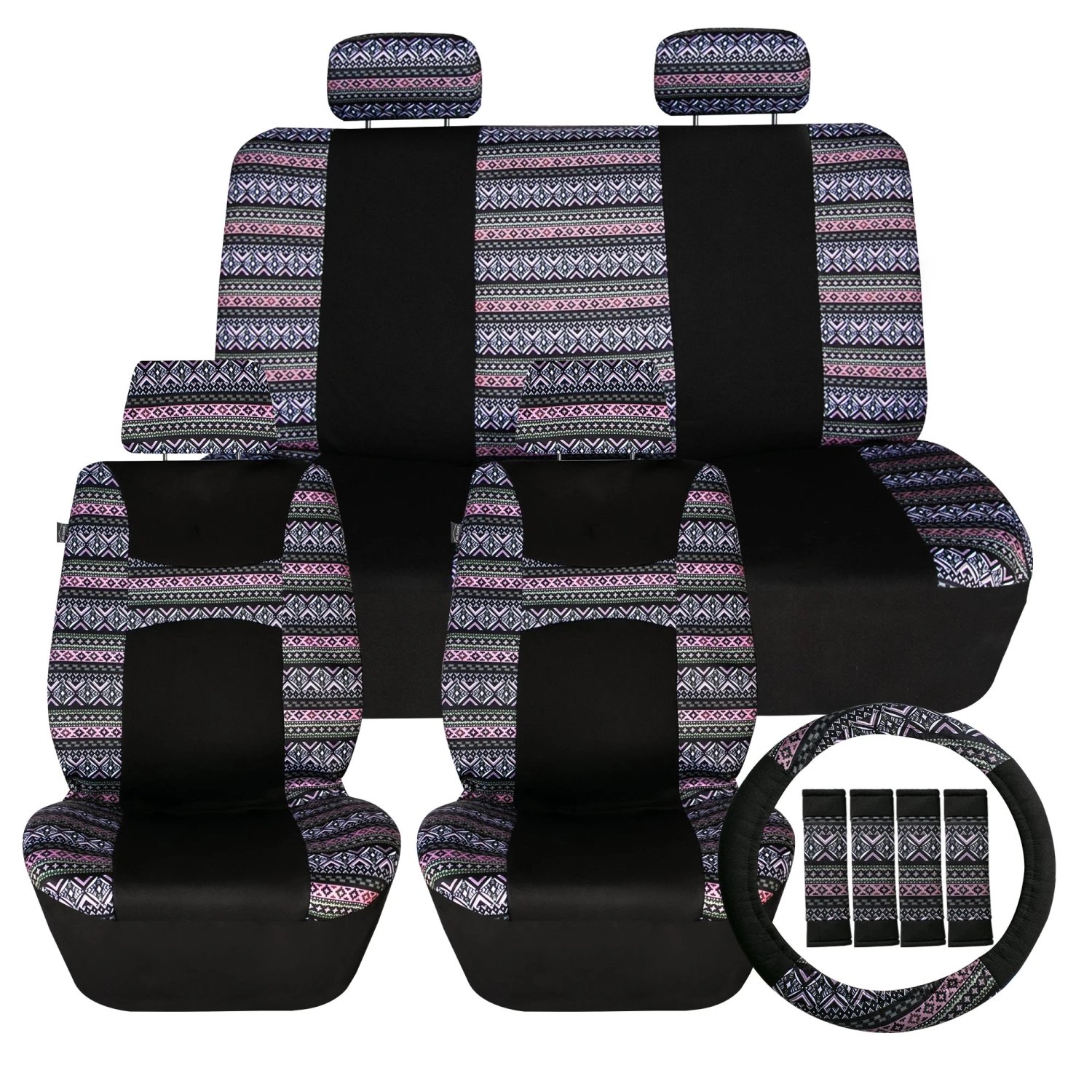 - Includes 2 bucket seat covers, 1 rear back bench seat cover, 4 separate headrest covers, 1 steering wheel cover, 4 seat belt pads