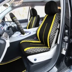 We Are Young Life Is Fun Checker Printed Seat Covers, Floor Mats, And Steering Wheel Cover – Yellow Combo Full Set(We Are Young Life Is Fun Checker Printed Seat Covers Floor Mats And Steering Wheel Cover Yellow Combo Full Set)