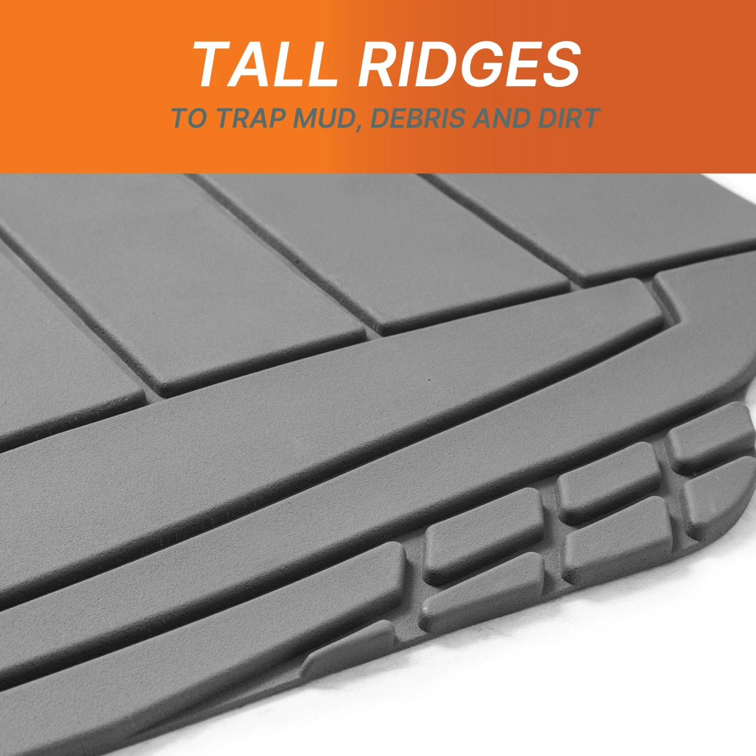 - TALL OUTER RIDGES: The mats are designed with tall outer ridges that’serve as an effective barrier, preventing fluids from leaking onto the vehicle’s carpets. This design ensures that any accidental spills or leaks are contained.
