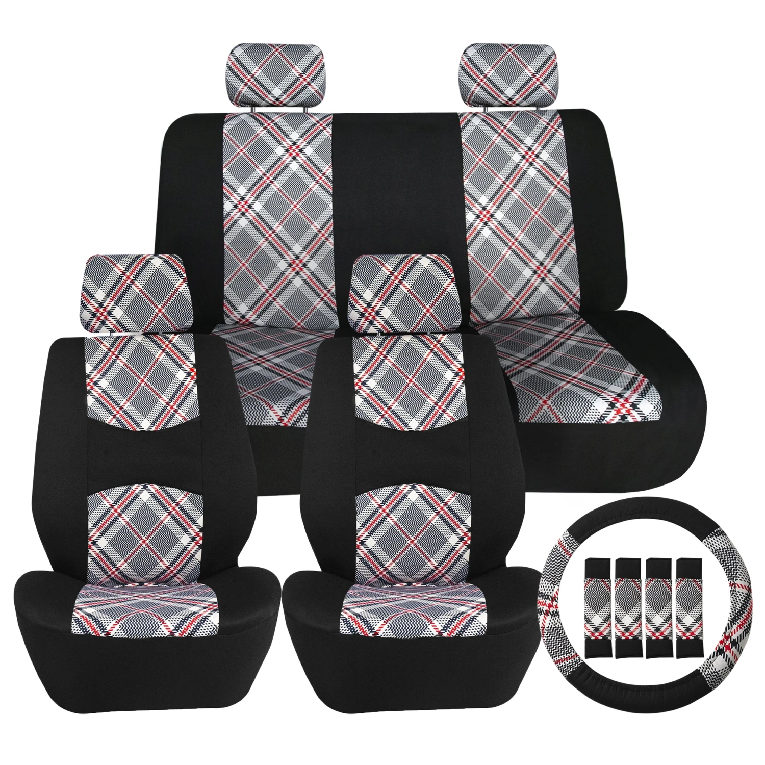 - Includes 2 bucket seat covers, 1 rear back bench seat cover, 4 separate headrest covers, 1 steering wheel cover, 4 seat belt pads