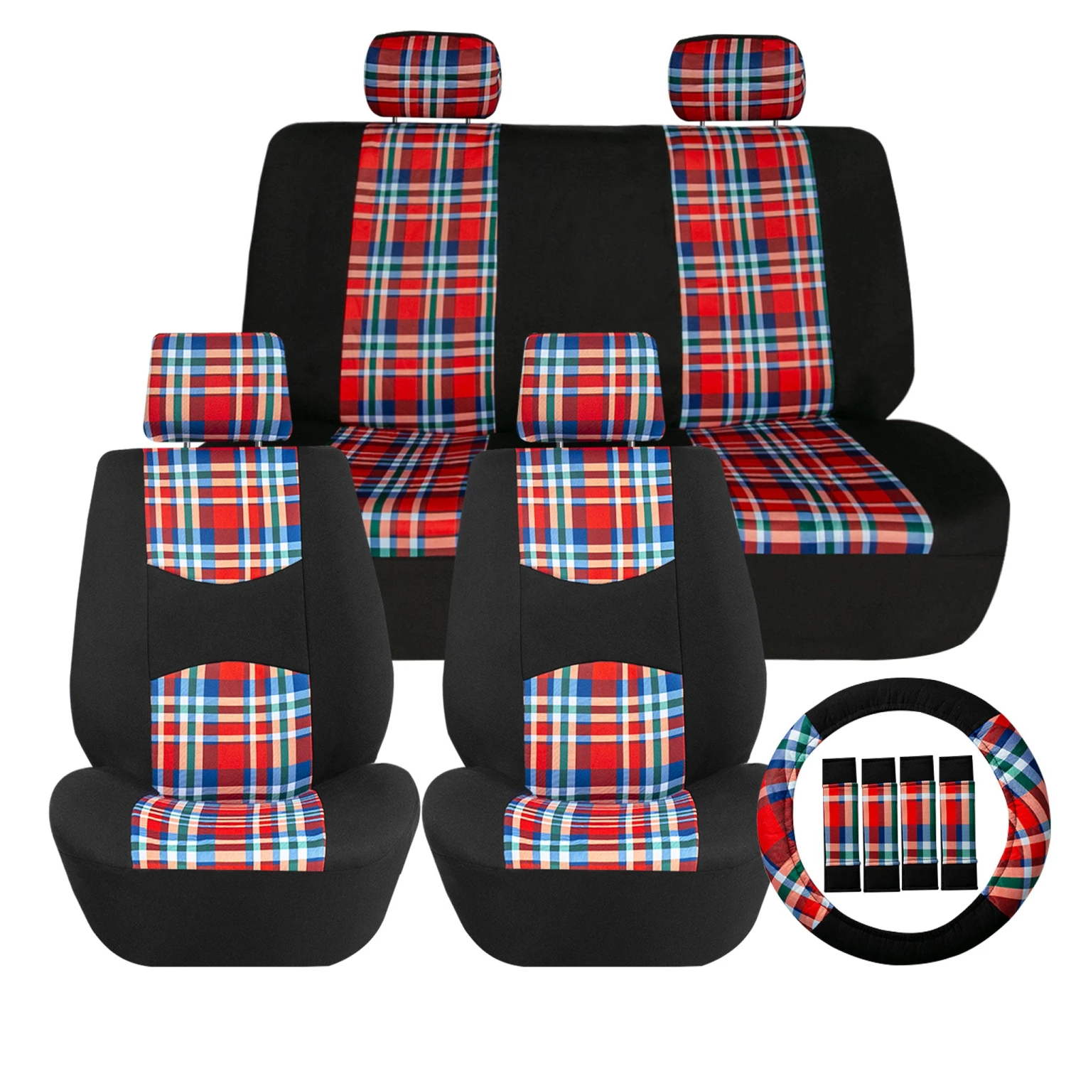 - Includes 2 bucket seat covers, 1 rear back bench seat cover, 4 separate headrest covers, 1 steering wheel cover, 4 seat belt pads
