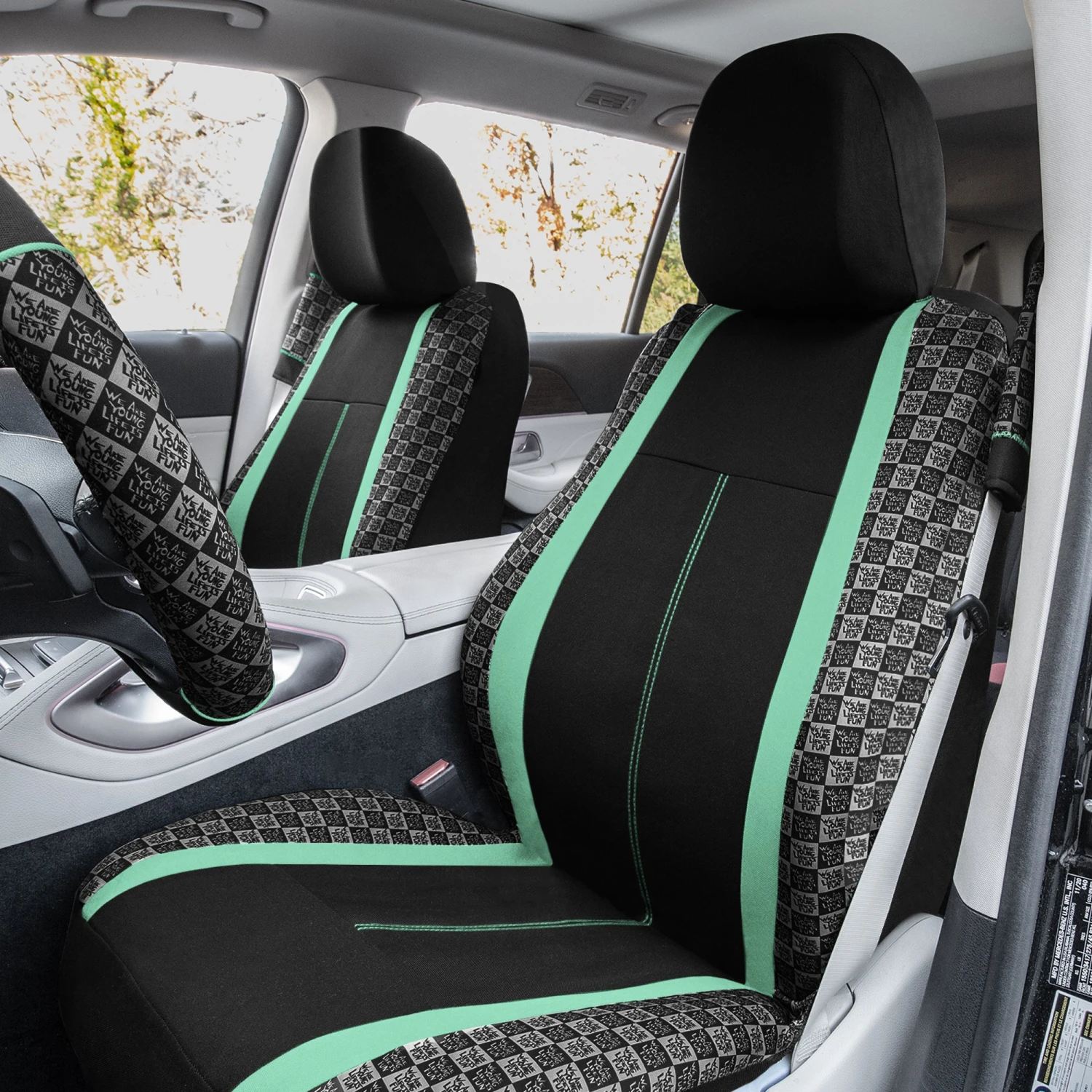 We Are Young Life Is Fun Checker Printed Seat Covers – Combo Full Set Mint(We Are Young Life Is Fun Checker Printed Seat Covers Combo Full Set Mint)