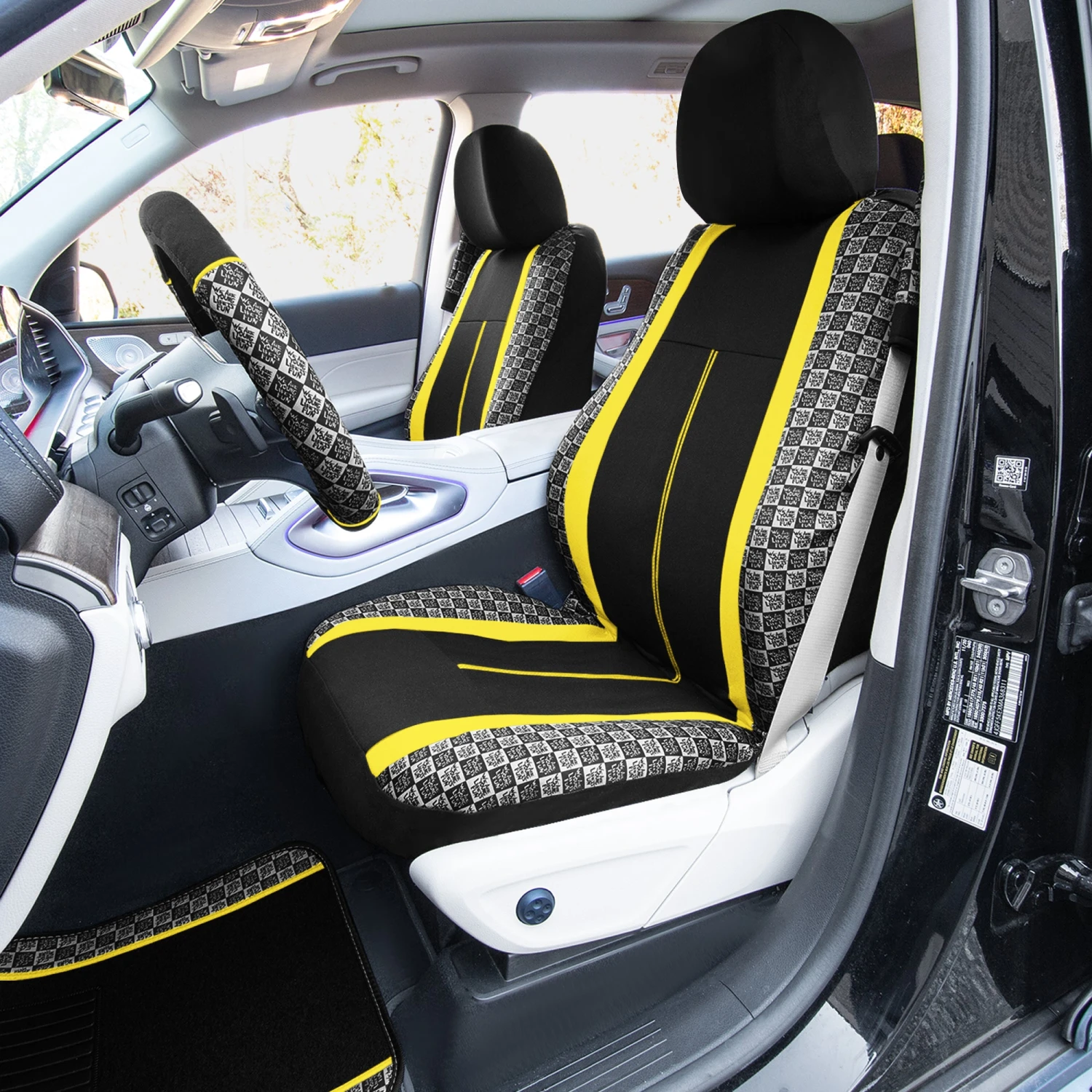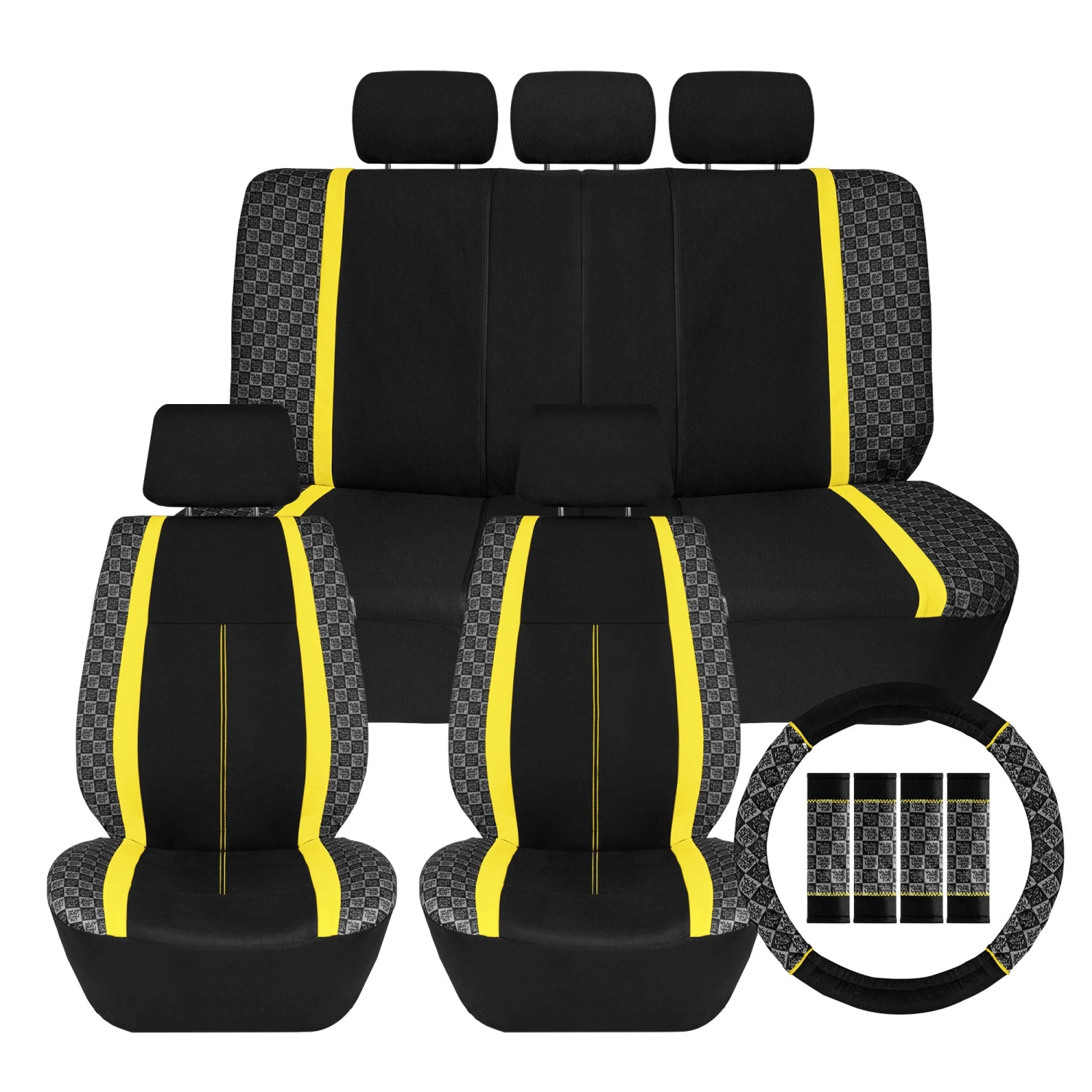 - Includes 2 bucket seat covers, 1 rear back bench seat cover, 4 separate headrest covers, 1 steering wheel cover, 4 seatbelt pads